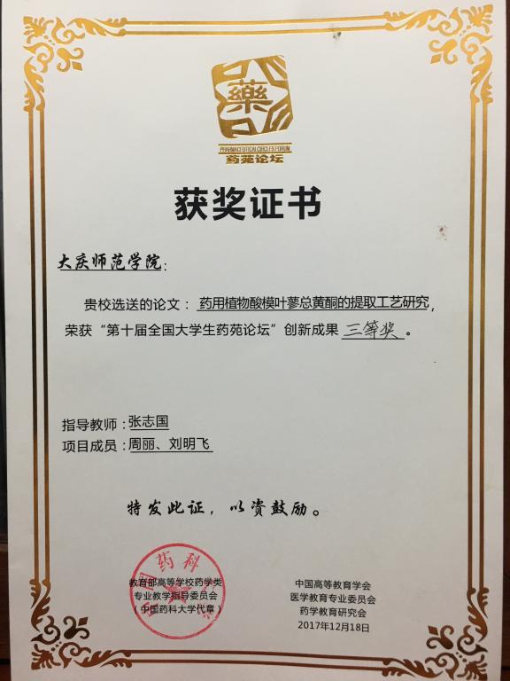通过论文网上评审、员工壁报成果展示、现场答辩和专家现场提问等多个环节,由周丽和刘明飞同学完成、张志国教师指导的论文“药用植物酸模叶蓼总黄酮的提取工艺研究”最终获得“创新成果三等奖”。在答辩过程中,周丽同学答辩过程流畅,回答问题清晰准确,展现出了庆师人良好的精神风貌,获得了优异成绩。这次参赛。充分展示了公司生物制药专业员工的科学素养、专业技能和综合素质,凸显了应用型人才培养的成效。