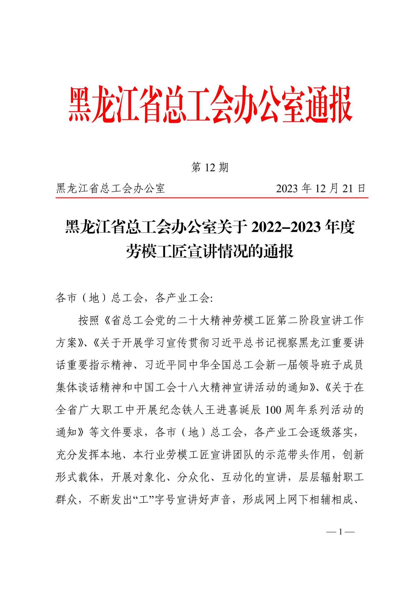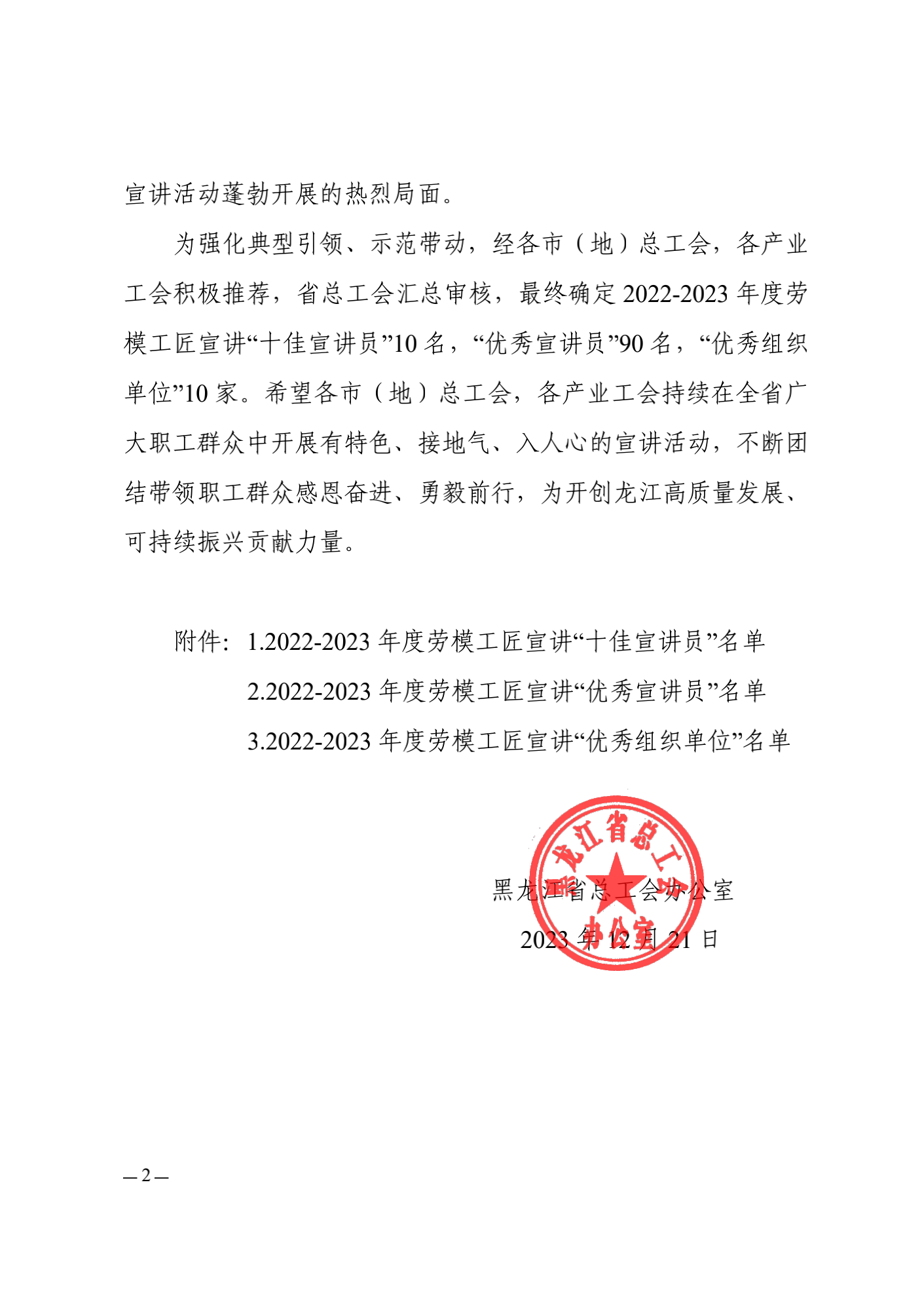 经各市(地)总工会,各产业工会积极推荐,省总工会汇总审核,最终确定2022--2023年度劳模工匠宣讲“十佳宣讲员”10名,“优秀宣讲员”90名,“优秀组织单位”10家。bevictor伟德官网教师李颖雪荣获2022⁻2023年度黑龙江省总工会颁发的劳模工匠宣讲“优秀宣讲员”称号(大庆市共有5位宣讲员获奖)。特此祝贺!