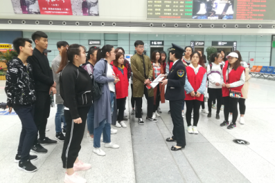 在青协社团心理部工作人员的带领下,早上6点30分,志愿者们早已站在火车站的服务中心,穿上了红色马甲,等待着一天的工作。志愿者先与工作人员进行了交流,他们对志愿者的到来表示欢迎,同时他们讲解了服务的区域和具体流程。听完队长的指示及分配后,志愿者们快速就位,进入工作状态。站在火车站进站口的几名志愿者,为找不到位置的乘客指路,引领他们找到正确的位置;自动售票口的志愿者,为不会操作的老人和小孩进行讲解,帮助他们取票;站在楼梯口的志愿者,为行李过多的旅客搬运行李,减轻他们的负担。站在出站口的志愿者,为旅客指明了出站的方向。火车站随处可见红色的身影在匆匆的忙碌着。时间过的飞快,转眼已是上午10点30分,志愿者们顺利的结束了一上午的志愿服务工作,并一起合影留念。