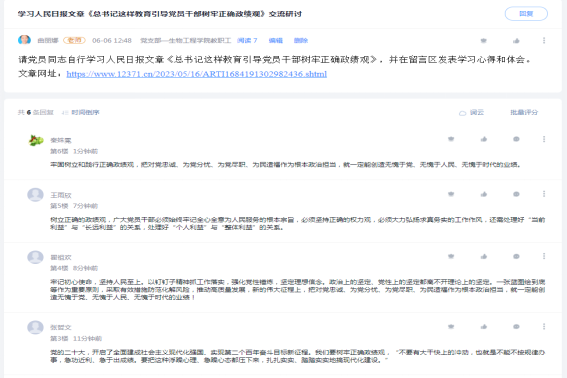 教工支部组织党员学习人民日报文章,并在学习通主题讨论板块开展交流讨论。党员同志发表学习心得和体会,表示作为新时代高校教师党员,要时刻铭记初心使命,牢记立德树人的根本任务,树立正确政绩观,做政治清醒、政治敏锐和严守纪律的党员。