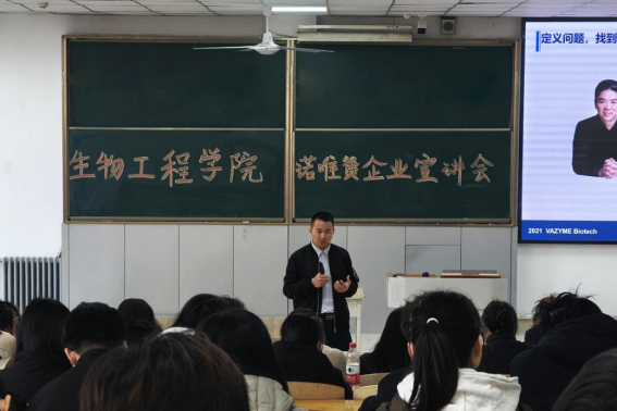 宣讲会上,张国洋先生详细介绍了公司的发展历程与未来愿景。诺唯赞生物依托自主技术平台,深耕生命科学、体外诊断、生物医药等领域,是国内少数同时具备上游技术开发能力和终端产品生产能力的研发创新型企业。张国洋先生还回顾了公司与公司的长期合作历程。自校企共建就业实习基地以来,双方在就业实践与教学实习方面展开了密切合作,累计输送近百名优秀毕业生入职公司,涵盖科研、销售、实验等多个岗位。许多毕业生已成长为公司的中坚力量,部分优秀人才更是走上了管理岗位,充分体现了诺唯赞为员工提供的广阔发展平台。