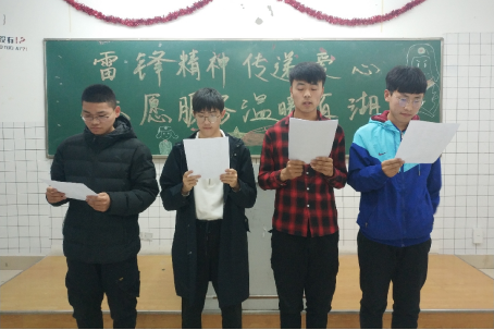 同学们的朗诵《雷锋好榜样》表达了对雷锋的尊敬与赞扬,朗诵《雷锋精神永不忘》,《雷锋精神两相传》是对雷锋精神的传承与弘扬,是我们青年一代志愿精神的体现。同学们的歌曲《新时代》、《走向复兴》、《我的中国心》让我们看到了青年一代对时代的赞扬五与蓬勃的朝气,他们勇于肩负起社会责任,传承优秀精神与传统,做新时代的栋梁。