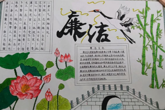 此次廉洁文化教育活动以手抄报、主题班会等多种形式开展,使传统廉洁文化教育和校园文化活动相促进。同学们积极参加此次活动,用优美的文字,小小的画笔,精心设置版面,以图绘廉,以文述廉,以手抄报作品表达自己对廉洁文化的总体认识、基本理念和精神追求,彰显教育的清廉本色。一幅幅作品极大丰富了清廉校园的内涵,员工们在润物无声中受到了廉洁教育。