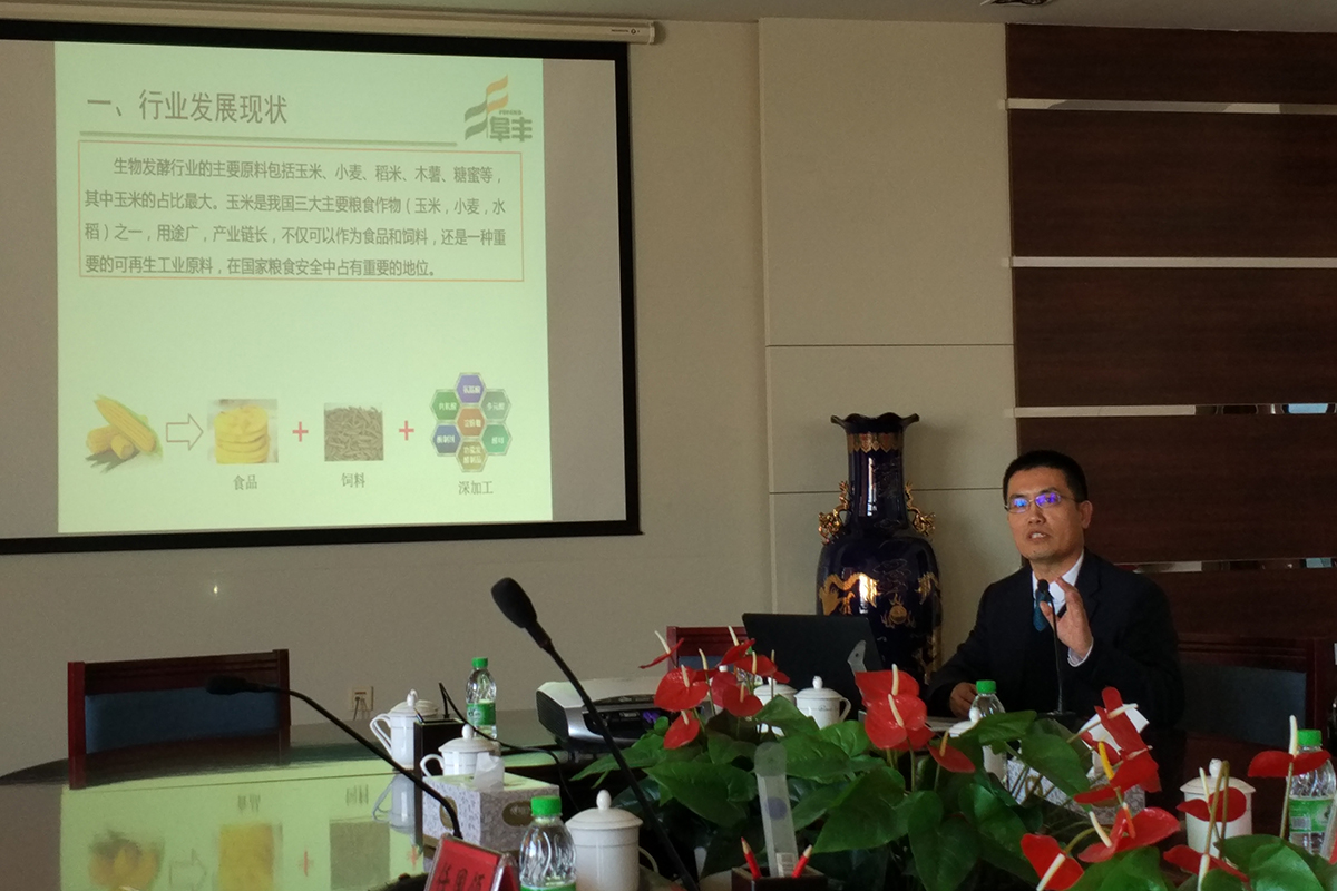 证书颁发仪式结束后,赵兰坤总经理为公司领导、师生代表作了题为“生物发酵(氨基酸)行业发展现状探讨及东北阜丰公司生产研发现状介绍”的报告,赵兰坤总经理从行业发展现状、阜丰集团发展情况、东北公司发展情况、谷物深加工、产学研结合情况、企业环保、集团未来规划等六个方面作了一个内容十分丰富的报告。